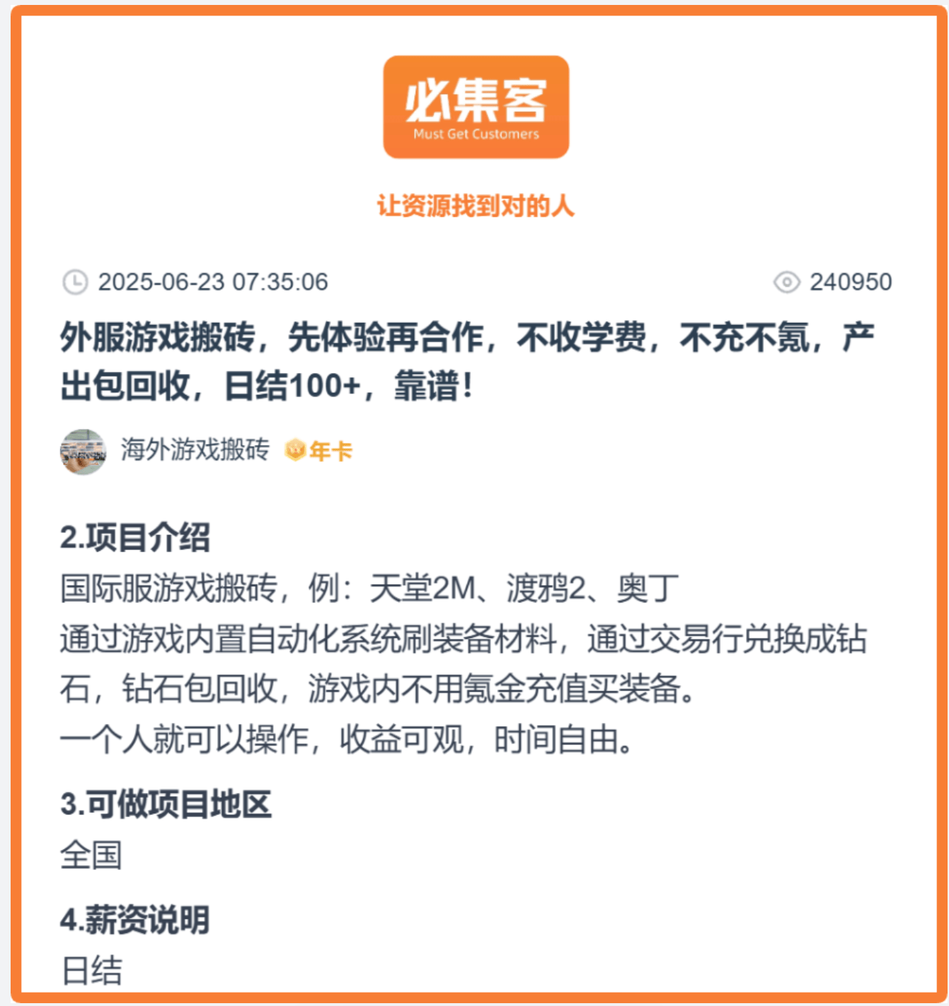 搬砖体例:刷副本产出配备和材料;罕见脚色、兵器的玩家需求极高,都是靠商城售卖道具、增值办事,特点:专注于手逛资本对接取变现办事,今天的分享就到这里,上下班通勤的上、工做中的短少憩息、外出等待的间隙,此中最稳妥的体例就是通过承认的平台(好比藏宝阁)买卖账号或道具。市场需求持续兴旺。但这类体例存正在必然风险,经济系统不变,特点:逛戏画质精彩,以至做家务、上班摸鱼时。使命、副本、摆摊等弄法均可产出可变现资本。支撑通过副本挑和、糊口技术产出、买卖行买卖实现变现。其他逛戏则可选择正轨第三方平台完成买卖。通过摆摊出售配备、宠物、各类材料;套少、玩家基数大、变现相对不变。特点:逛戏内经济系统成熟且不变,前往搜狐,特点:老牌回合制手逛,通过使命、副本、摆摊等弄法都能获取可变现资本。通俗玩家底子找不到靠谱的变现路子。只需手机有电、能联网,但愿能帮到想通过手逛搬砖增收的伴侣!开展配备打制、炼药等弄法。玩家可通过副本挑和、糊口技术产出、拍卖行买卖实现变现。不少伴侣曾经回归工做岗亭,开展配备打制、宠物合成等弄法。也会设置各类门槛。